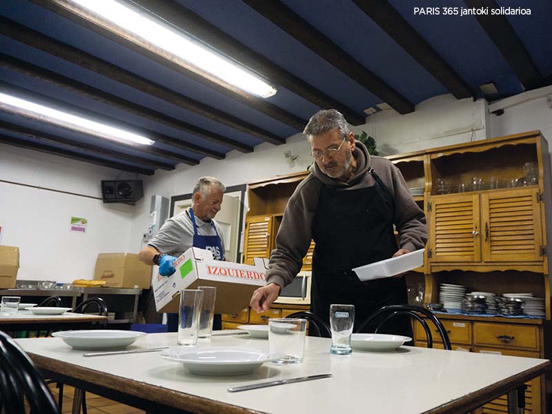 Paris 365 jantoki solidarioa 2009an sortu zen, urtebete lehenago lehertu zen krisi ekonomikoak eragindako beharrei aurre egiteko asmoz. Zaurgarritasun-egoeran dauden pertsonei janzkera eta elikadura duina bermatzea da erakundearen helburua, haien parte-hartze aktiboa eta independentzia bultzatzeaz batera. Hasieran, langabezian gelditu zen bertako jendea artatzen zuten gehienbat; egun, aldiz, Atzerritartasun Legearekin17 arazoak dituzten migratzaileei ematen diete arreta nagusiki. Gosaria, bazkaria eta afaria ematen dituzte egunero, eta ekarpenen bidez jasotzen dituzten elikagaiak despentsa solidarioan eskaintzen dituzte. Orobat18, bigarren eskuko bi arropa-denda ere badituzte; edonor joan daiteke erostera, baina jantoki solidarioko erabiltzaileek doan eskura ditzakete jantziak. Gainera, orientazio-zerbitzuak ere eskaintzen ditu fundazioak. 14 lagunek osatzen dute Paris 365eko lantaldea, eta ia 300 boluntario aritzen dira egunero-egunero otorduak banatzen.